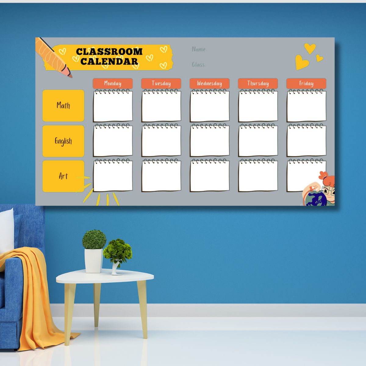 A classroom calendar is a helpful tool used by teachers and students to keep track of important dates, events, and activities throughout the school year. It often includes holidays, test days, project deadlines, birthdays, and special events like field trips or assemblies. Displayed visibly in the classroom, the calendar promotes organization, time management, and helps students stay engaged with daily routines and monthly goals.