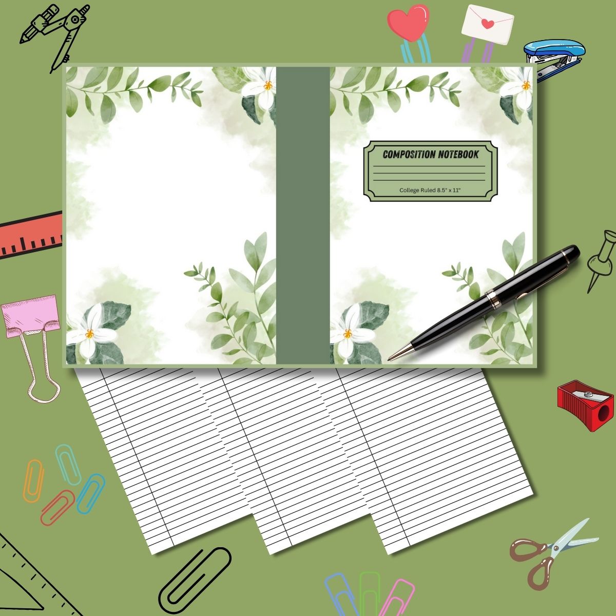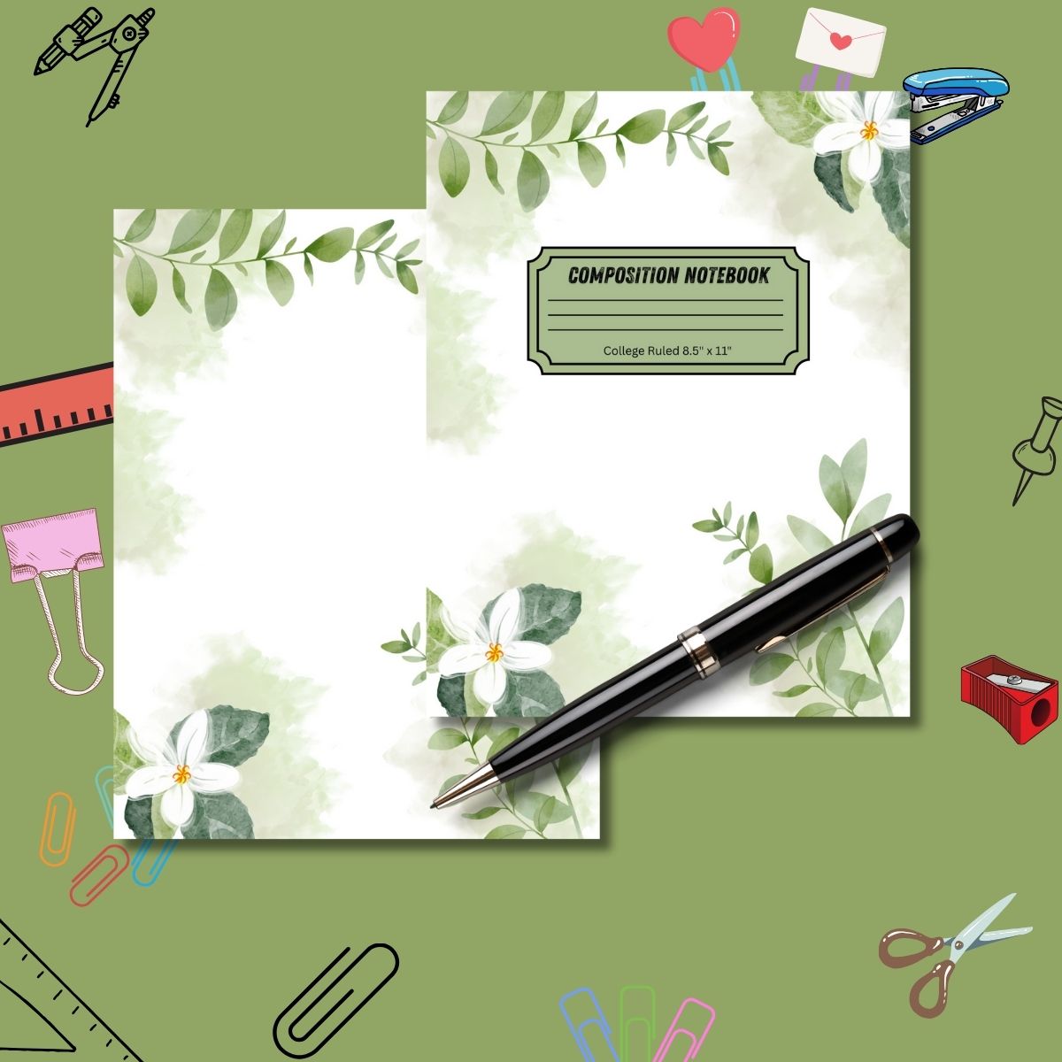 cover design for a college-ruled composition notebook, sized 8.5″ x 11″ 110 Pages (55 Sheets)It features a watercolor-style background with green leaves and white flowers, giving it a nature-inspired look.