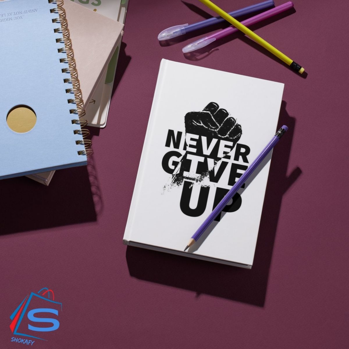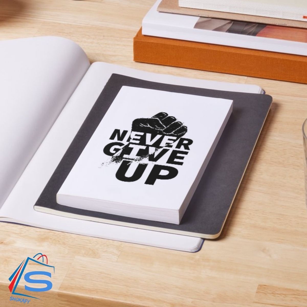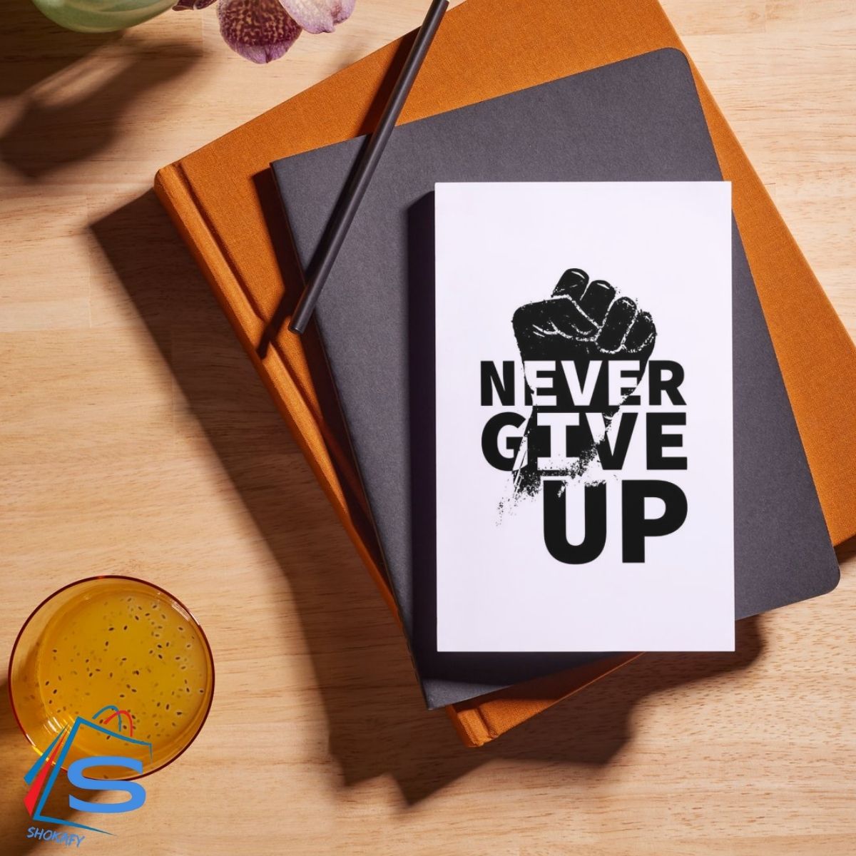 Never Give up conveys a sense of determination and motivation, encouraging the viewer to persevere and never give up. The use of a bold, black font and a fist icon adds to the overall theme of strength and resilience.